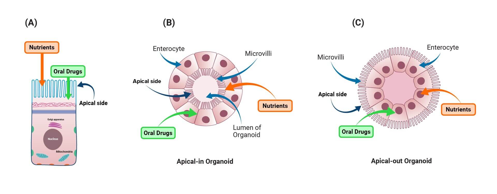 A. Nutrients and drugs are directly interacting with enterocytes at the apical-side. B. An organoid culture in animal-based hydrogel e.g. Matrigel with apical-in polarity. C. An organoid cultured in VitroGel® ORGANOID with apical-out polarity.