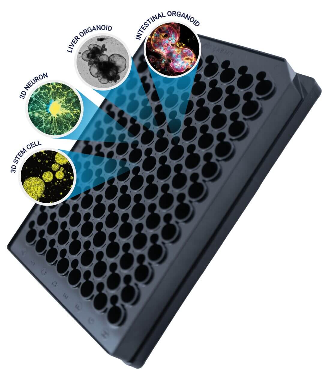 A premium 3D cell culture plate featuring a unique media-exchange channel and “sample locking” technology, combined with a premium ultra-clear cover-glass bottom for a zero-disruption 3D cell culture workflow.