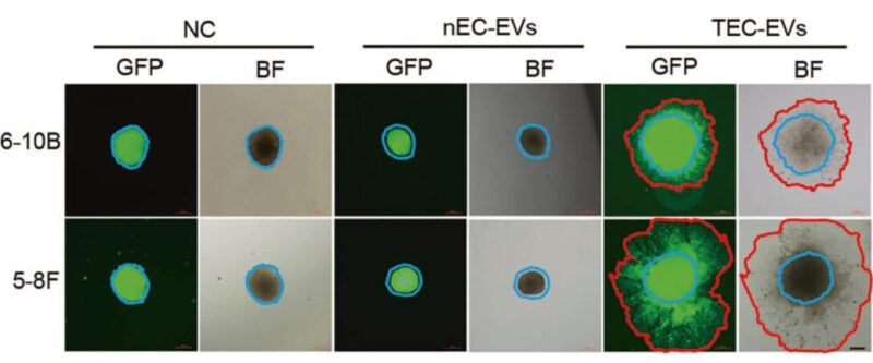 MCF-7 cells were encapsulated in a hydrogel matrix by mixing the cell suspension with VitroGel® Hydrogel Matrix. After allowing the mixture to stabilize at room temperature for 10 min, NHDF cells were added on top of the hydrogel for 2D hydrogel coating culture. The NHDF cells attached and moved inside the hydrogel matrix after 48 hours of culture. The NHDF cells grew surrounding the MCF-7 spheroids and supported the fast growth of MCF-7 for large tumor structure formation.