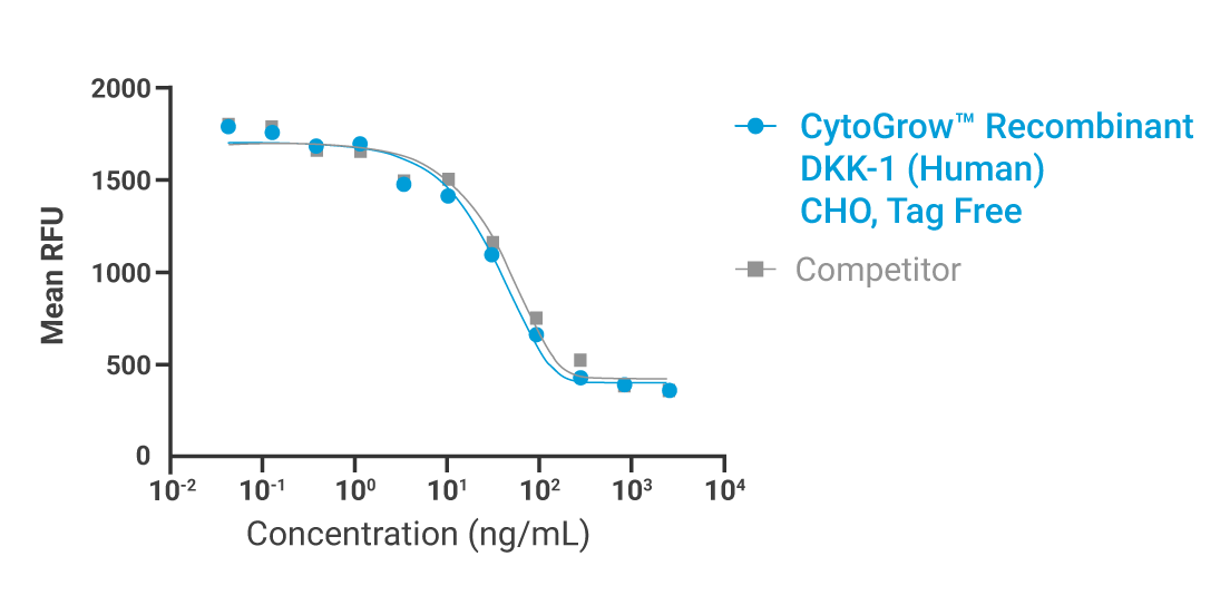Biological activity of the CytoGrow™ Recombinant DKK-1 (Human), CHO, Tag Free was measured by its ability to inhibit 50ng/ml Wnt-3a induced Top flash reporter activity in CHO cells.