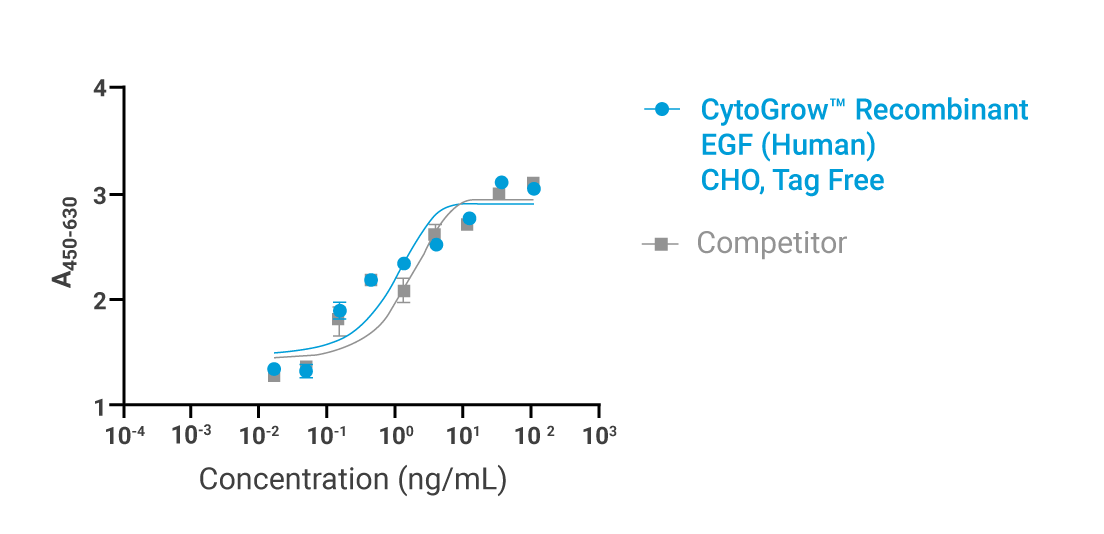 Biological activity of the CytoGrow™ Recombinant EGF (Human), CHO, Tag Free was assessed based on the stimulation of NIH3T3 cell proliferation. The expected ED50 is less than or equal to 0.3 ng/mL. The data presents a head-to-head comparison with industry-leading competitors.