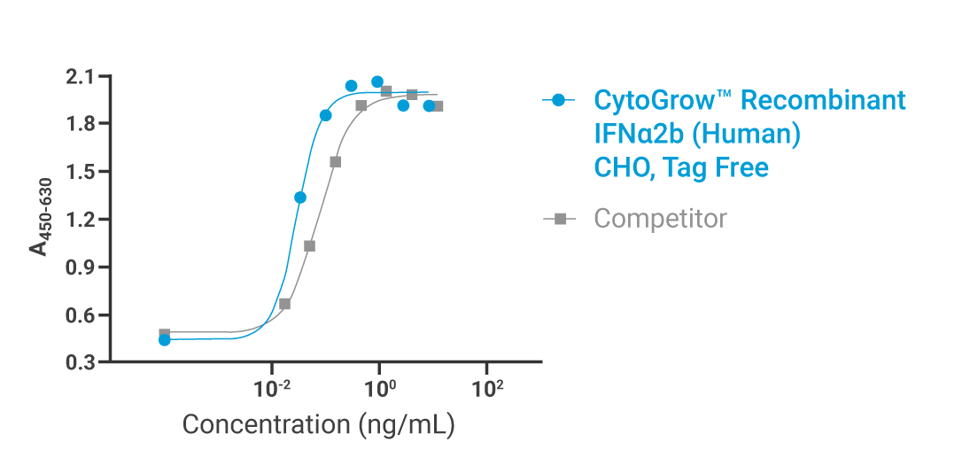 Biological activity of the CytoGrow™ Recombinant IFNα2b (Human), CHO, Tag Free was measured in a VSV inhibition assay using Wish cells. The ED₅₀ for this effect is ≤100 pg/mL, corresponding to a specific bioactivity of ≥1 × 10⁷ units/mg. The data presents a head-to-head comparison with industry-leading competitors.