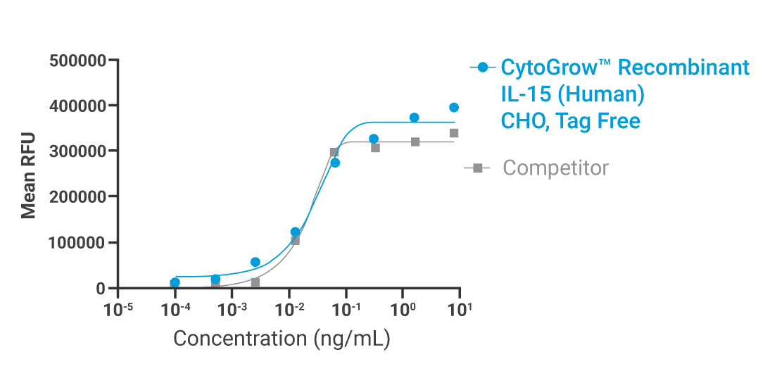 Biological activity of the CytoGrow™ Recombinant IL-15 (Human), CHO, Tag Free was measured in a cell proliferation assay using CTLL-2 mouse cytotoxic T cells. The ED₅₀ for this effect is ≤0.5 ng/mL. The data presents a head-to-head comparison with industry-leading competitors.