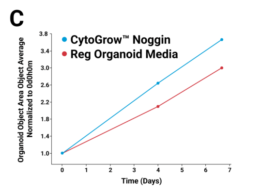 C. Organoid growth area over 6 days shows that CytoGrow™ Noggin (Human) growth factor supports faster intestinal organoid expansion compared to other growth factors.