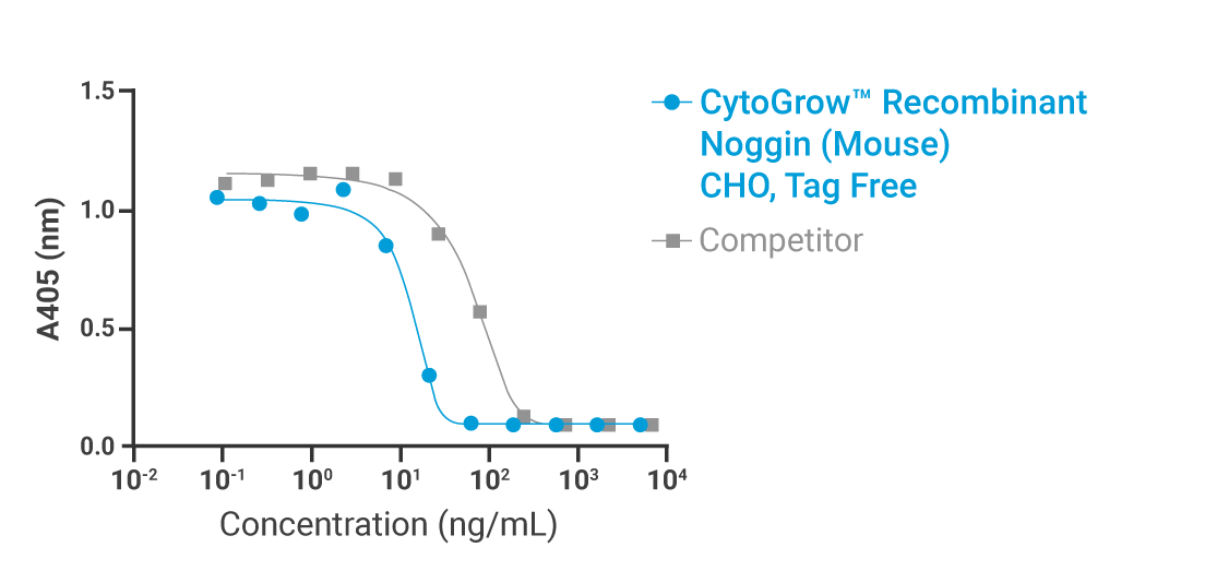 Biological activity of the CytoGrow™ Recombinant Noggin (Mouse), CHO, Tag Free was measured by its ability to inhibit 5.0 ng/mL of BMP-4–induced alkaline phosphatase production in ATDC-5 chondrogenic cells. The data presents a head-to-head comparison with industry-leading competitors.