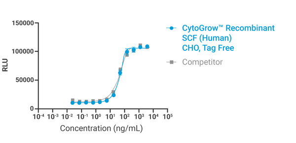 Biological activity of the CytoGrow™ Recombinant SCF (Human), CHO, Tag Free was demonstrated by its ability to stimulate proliferation of TF-1 cells. The ED₅₀ for this effect is 5–8 ng/mL. The data present a head-to-head comparison with industry-leading competitors.